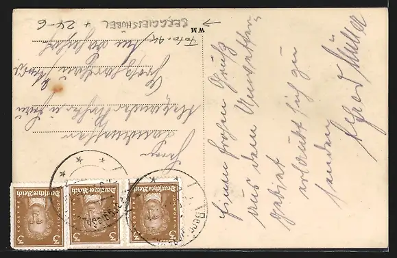 Personenbezogene Daten auf der Rückseite der Karte wurden durch blauen Textmarker unkenntlich gemacht. Die blauen Stellen sind auf die Vorderseite durchgeweicht und wirken sich negativ auf das Postkartenfoto aus
