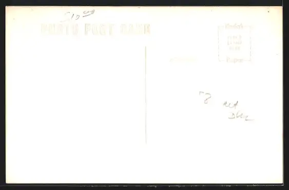 Personenbezogene Daten auf der Rückseite der Karte wurden durch blauen Textmarker unkenntlich gemacht. Die blauen Stellen sind auf die Vorderseite durchgeweicht und wirken sich negativ auf das Postkartenfoto aus
