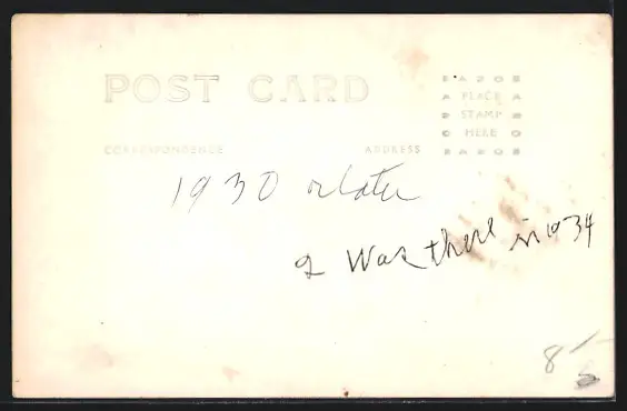 Personenbezogene Daten auf der Rückseite der Karte wurden durch blauen Textmarker unkenntlich gemacht. Die blauen Stellen sind auf die Vorderseite durchgeweicht und wirken sich negativ auf das Postkartenfoto aus