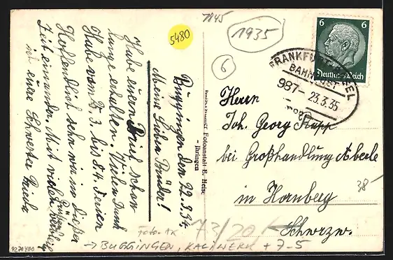 gelaufen 1935, rückseitig Klebe- und Papierreste, guter Zustand