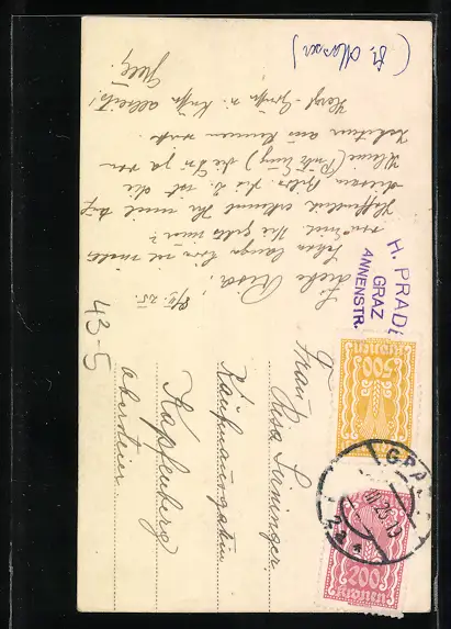 Personenbezogene Daten auf der Rückseite der Karte wurden durch blauen Textmarker unkenntlich gemacht. Die blauen Stellen sind auf die Vorderseite durchgeweicht und wirken sich negativ auf das Postkartenfoto aus