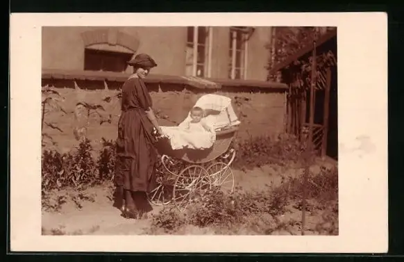 Foto-AK Dame mit Kinderwagen an sonnigem tag