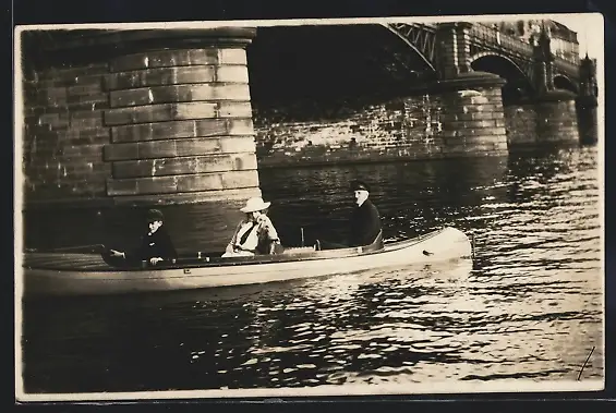 Foto-AK Drei Herrschaften im Boot an einer Brücke