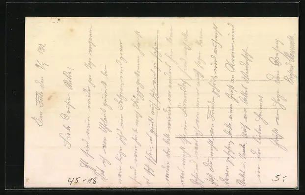 Personenbezogene Daten auf der Rückseite der Karte wurden durch blauen Textmarker unkenntlich gemacht. Die blauen Stellen sind auf die Vorderseite durchgeweicht und wirken sich negativ auf das Postkartenfoto aus