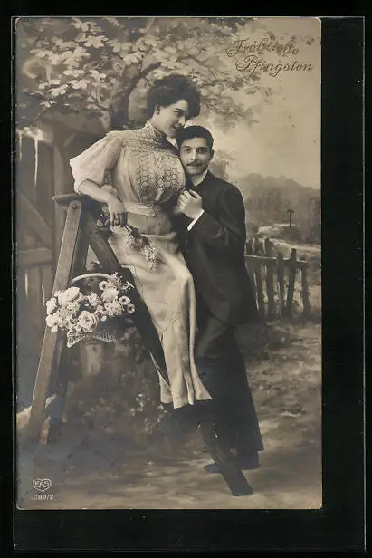Foto-AK EAS: Liebespaar an einer Leiter, Pfingstgruss
