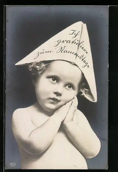 Foto-AK EAS Nr. 319: Kleines Kind mit neugierigem Blick und Spitzmütze