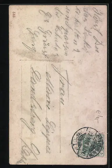 Personenbezogene Daten auf der Rückseite der Karte wurden durch blauen Textmarker unkenntlich gemacht. Die blauen Stellen sind auf die Vorderseite durchgeweicht und wirken sich negativ auf das Postkartenfoto aus