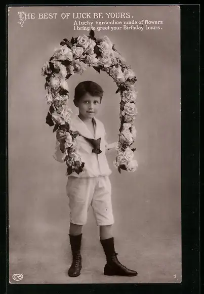 Foto-AK EAS: The best of luck be yours, Knabe mit Blumen-Hufeisen