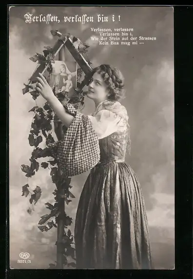 Foto-AK EAS: Verlassen, verlassen bin i!, Fräulein an einem Bildstock