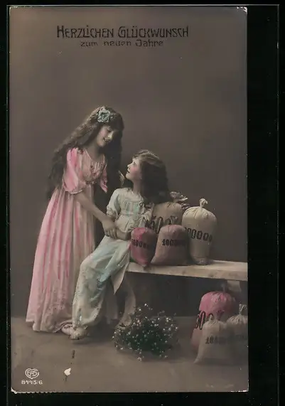 Foto-AK EAS: Zwei Mädchen mit Geldsäcken auf einer Bank sitzend