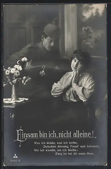 Foto-AK Einsam bin ich, nicht alleine!, Was ich denke, was ich treibe..., Frau erscheint Geist ihres Mannes