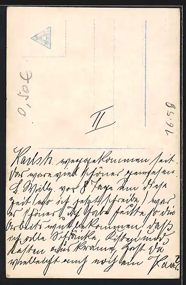 Personenbezogene Daten auf der Rückseite der Karte wurden durch blauen Textmarker unkenntlich gemacht. Die blauen Stellen sind auf die Vorderseite durchgeweicht und wirken sich negativ auf das Postkartenfoto aus