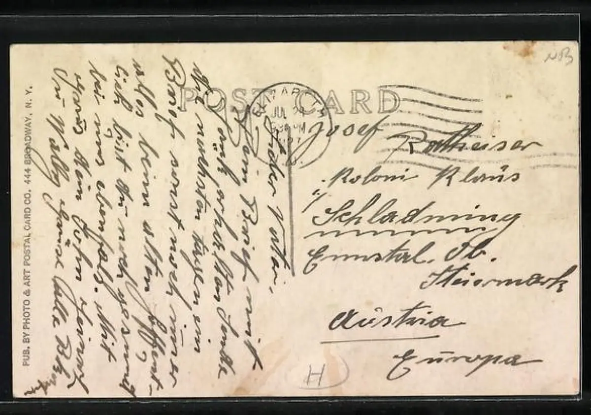 Personenbezogene Daten auf der Rückseite der Karte wurden durch blauen Textmarker unkenntlich gemacht. Die blauen Stellen sind auf die Vorderseite durchgeweicht und wirken sich negativ auf das Postkartenfoto aus