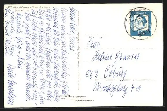 Personenbezogene Daten auf der Rückseite der Karte wurden durch blauen Textmarker unkenntlich gemacht. Die blauen Stellen sind auf die Vorderseite durchgeweicht und wirken sich negativ auf das Postkartenfoto aus