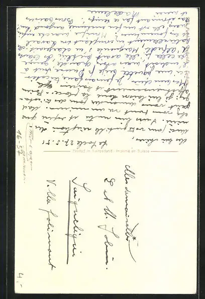 Personenbezogene Daten auf der Rückseite der Karte wurden durch blauen Textmarker unkenntlich gemacht. Die blauen Stellen sind auf die Vorderseite durchgeweicht und wirken sich negativ auf das Postkartenfoto aus