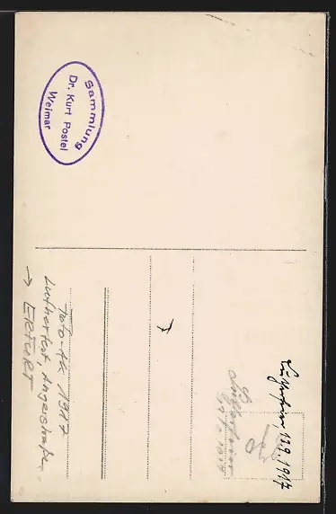 Personenbezogene Daten auf der Rückseite der Karte wurden durch blauen Textmarker unkenntlich gemacht. Die blauen Stellen sind auf die Vorderseite durchgeweicht und wirken sich negativ auf das Postkartenfoto aus