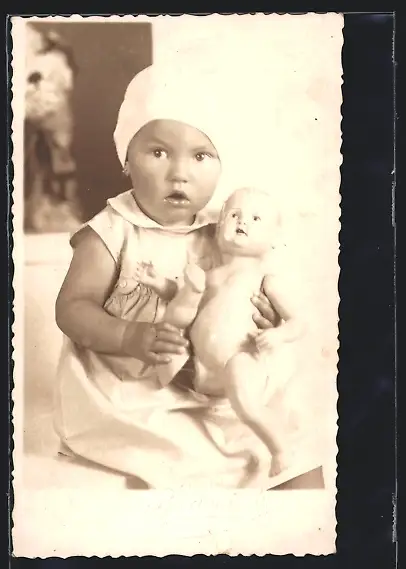 Foto-AK Erstauntes Kind mit nackter Puppe im Arm