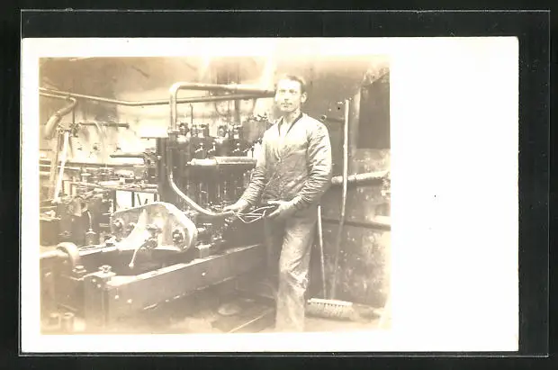 Foto-AK Fabrikarbeiter neben einer Maschinen