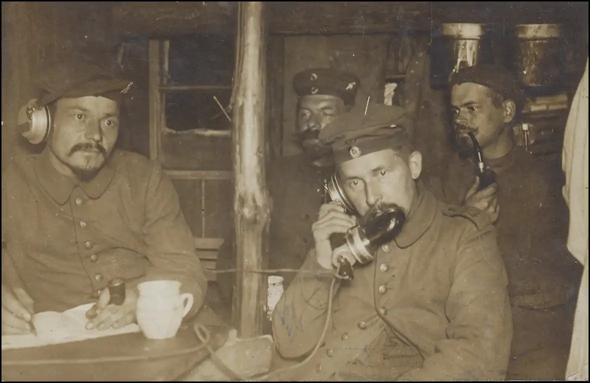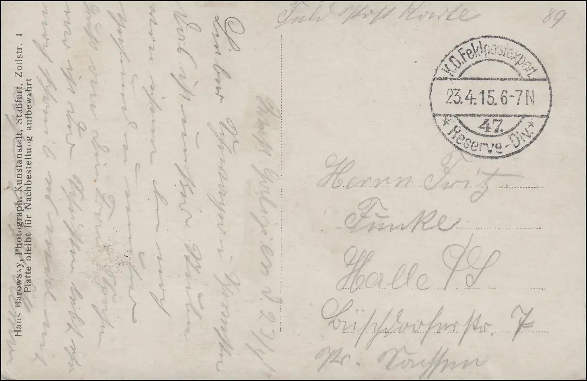 Foto-AK Fernmeldearbeit im Unterstand, FELDPOST 47. Res.-Div. 23.4.15