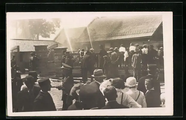 Foto-AK Feuerwehrleute löschen ein brennendes Haus
