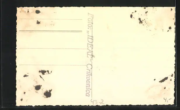 Personenbezogene Daten auf der Rückseite der Karte wurden durch blauen Textmarker unkenntlich gemacht. Die blauen Stellen sind auf die Vorderseite durchgeweicht und wirken sich negativ auf das Postkartenfoto aus