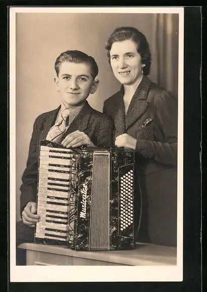 Foto-AK Frau und junger Mann mit einem Akkordeon