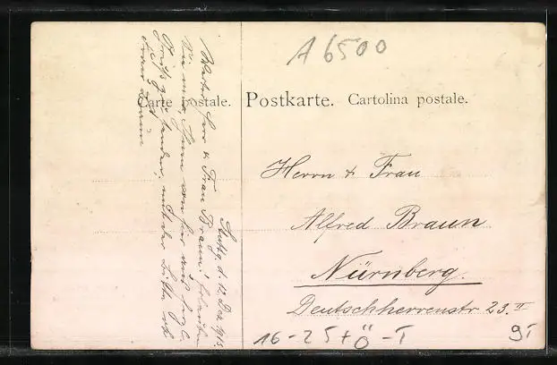 Personenbezogene Daten auf der Rückseite der Karte wurden durch blauen Textmarker unkenntlich gemacht. Die blauen Stellen sind auf die Vorderseite durchgeweicht und wirken sich negativ auf das Postkartenfoto aus