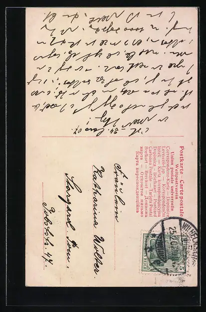 Personenbezogene Daten auf der Rückseite der Karte wurden durch blauen Textmarker unkenntlich gemacht. Die blauen Stellen sind auf die Vorderseite durchgeweicht und wirken sich negativ auf das Postkartenfoto aus