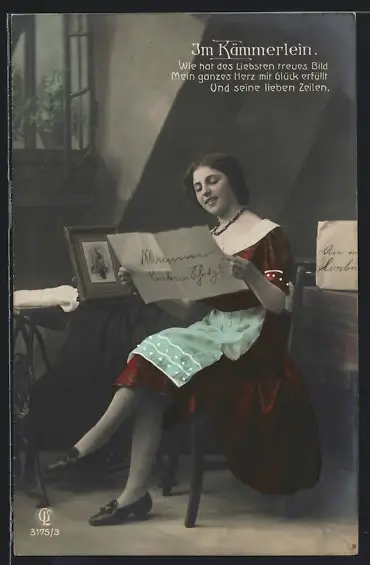 Foto-AK GL Co: Im Kämmerlein, Junge Frau mit Bild und Brief des Geliebten