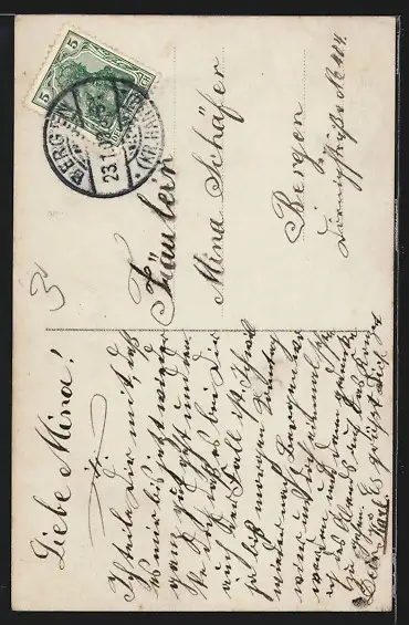 Personenbezogene Daten auf der Rückseite der Karte wurden durch blauen Textmarker unkenntlich gemacht. Die blauen Stellen sind auf die Vorderseite durchgeweicht und wirken sich negativ auf das Postkartenfoto aus