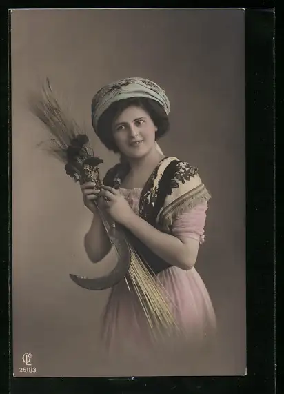 Foto-AK GL Co: Junge Bäuerin hält Getreideähren in der Hand