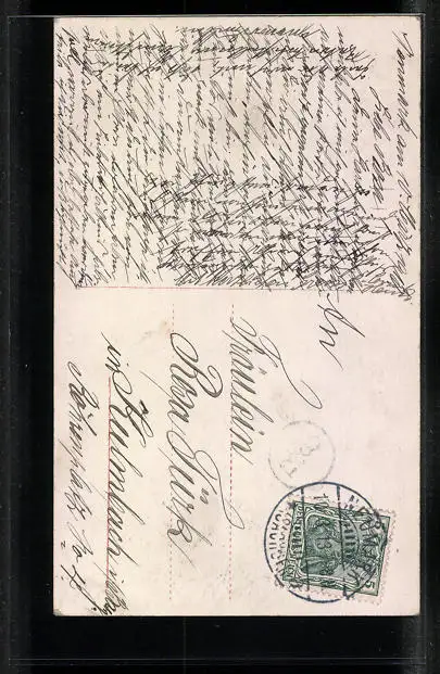 Personenbezogene Daten auf der Rückseite der Karte wurden durch blauen Textmarker unkenntlich gemacht. Die blauen Stellen sind auf die Vorderseite durchgeweicht und wirken sich negativ auf das Postkartenfoto aus