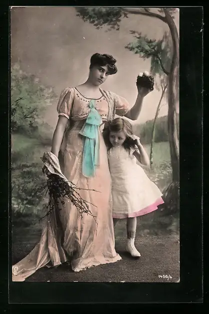 Foto-AK GL Co: Mutter und Tochter haben ein Vogelnest gefunden