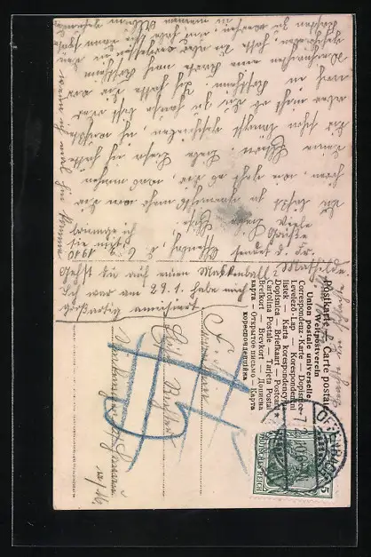 Personenbezogene Daten auf der Rückseite der Karte wurden durch blauen Textmarker unkenntlich gemacht. Die blauen Stellen sind auf die Vorderseite durchgeweicht und wirken sich negativ auf das Postkartenfoto aus