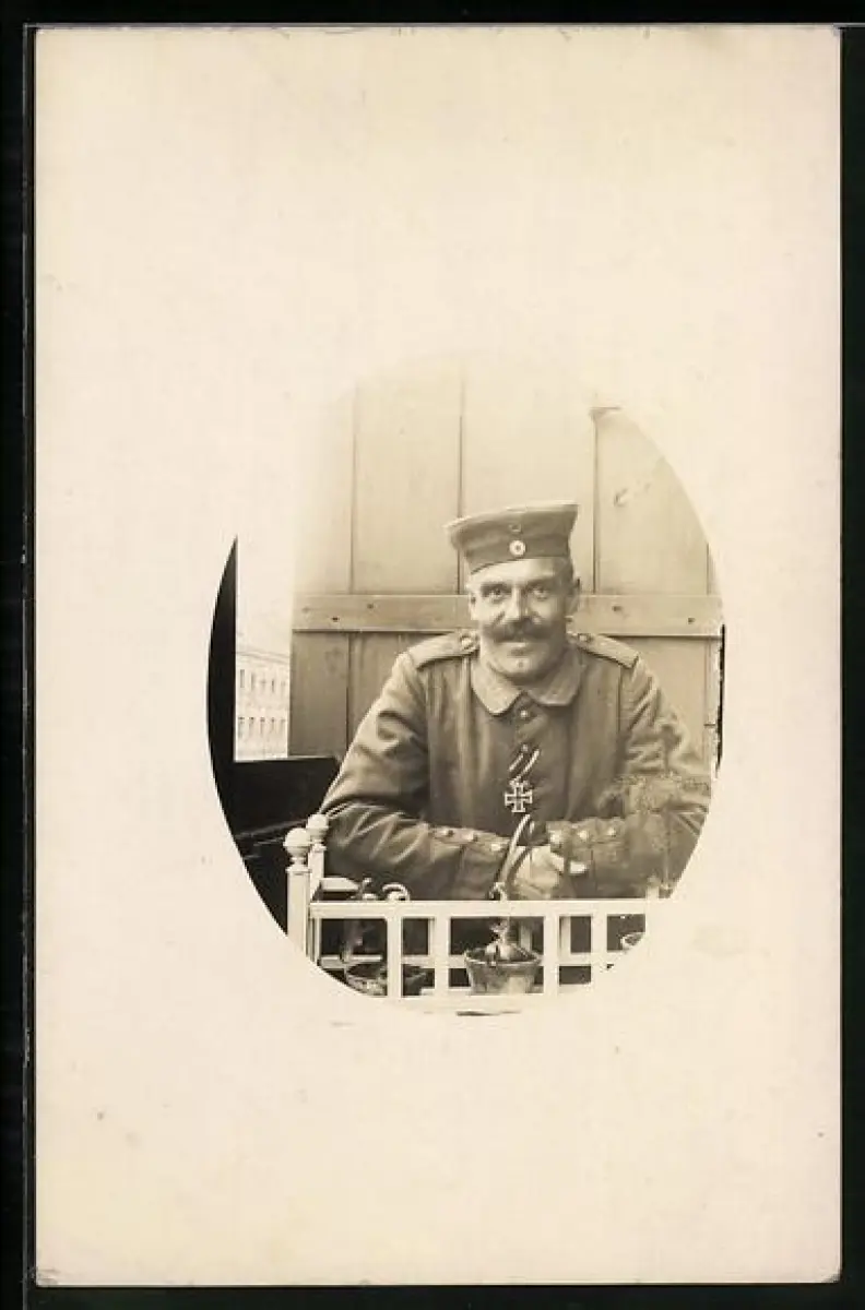 Foto-AK Garde-Soldat in Feldgrau Uniform mit EK II 1914 am Verleihungstage