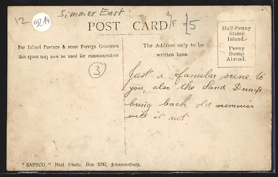 Personenbezogene Daten auf der Rückseite der Karte wurden durch blauen Textmarker unkenntlich gemacht. Die blauen Stellen sind auf die Vorderseite durchgeweicht und wirken sich negativ auf das Postkartenfoto aus