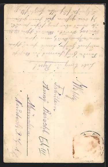 Personenbezogene Daten auf der Rückseite der Karte wurden durch blauen Textmarker unkenntlich gemacht. Die blauen Stellen sind auf die Vorderseite durchgeweicht und wirken sich negativ auf das Postkartenfoto aus