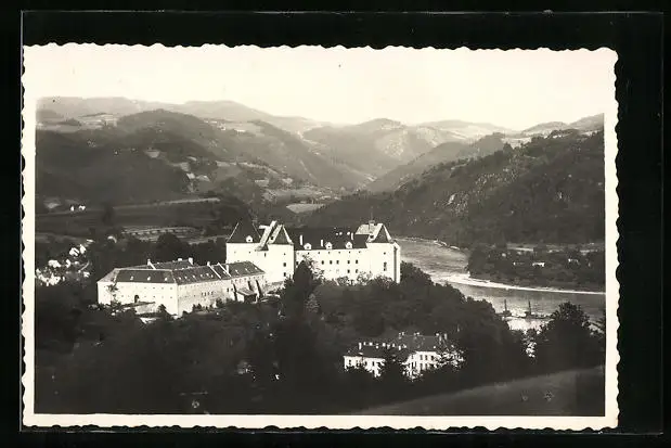 Foto-AK Grein an der Donau /Strudengau, Uferpartie mit Kloster