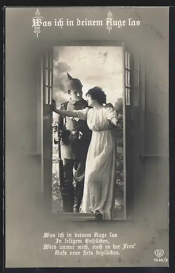 Foto-AK HB 7049 /2: Soldat in Uniform mit Pickelhaube kommt nach Hause zu seiner Liebsten