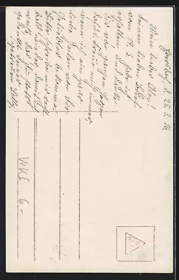 Personenbezogene Daten auf der Rückseite der Karte wurden durch blauen Textmarker unkenntlich gemacht. Die blauen Stellen sind auf die Vorderseite durchgeweicht und wirken sich negativ auf das Postkartenfoto aus