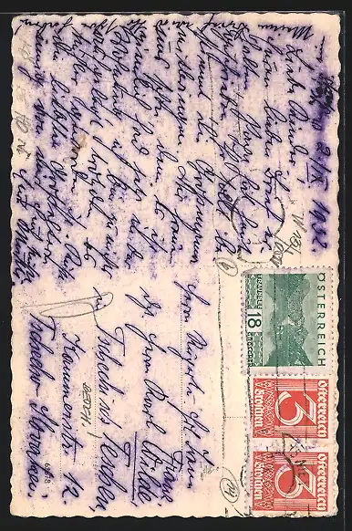 Personenbezogene Daten auf der Rückseite der Karte wurden durch blauen Textmarker unkenntlich gemacht. Die blauen Stellen sind auf die Vorderseite durchgeweicht und wirken sich negativ auf das Postkartenfoto aus