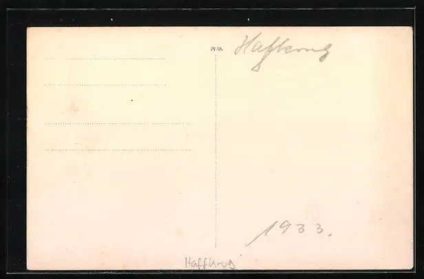 Personenbezogene Daten auf der Rückseite der Karte wurden durch blauen Textmarker unkenntlich gemacht. Die blauen Stellen sind auf die Vorderseite durchgeweicht und wirken sich negativ auf das Postkartenfoto aus