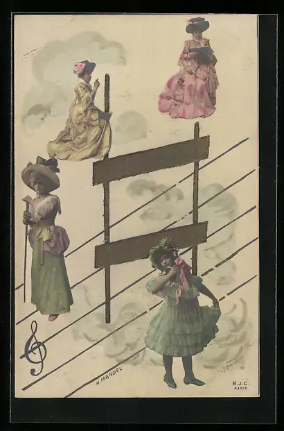Foto-AK Henri Manuel: Frauen in bunten Kleidern mit Notenschlüssel
