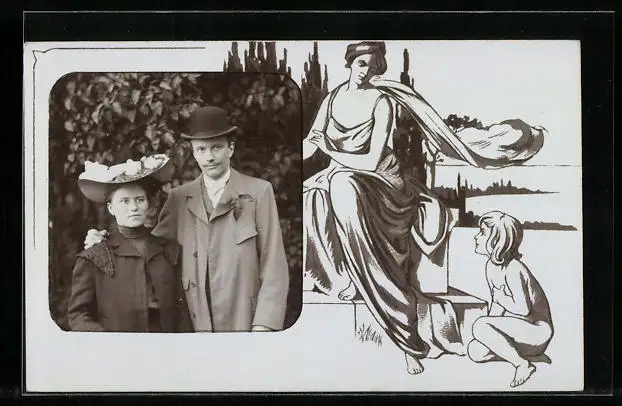 Foto-AK Herr mit einer Dame im Arm, Frau mit einem Kind, Passepartout