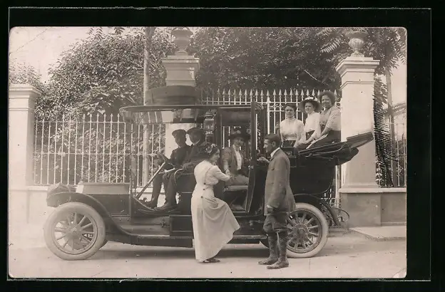 Foto-AK Herrschaften am Auto vor einem Tor