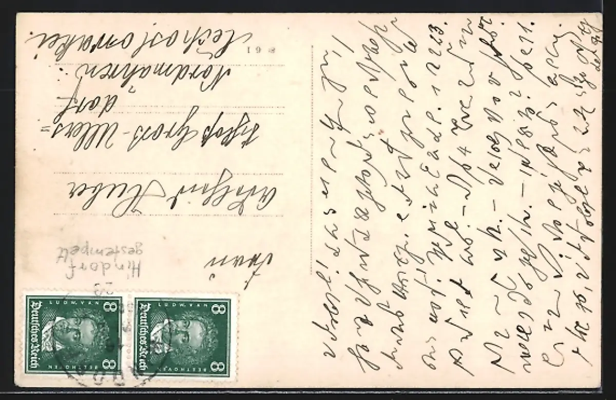 Personenbezogene Daten auf der Rückseite der Karte wurden durch blauen Textmarker unkenntlich gemacht. Die blauen Stellen sind auf die Vorderseite durchgeweicht und wirken sich negativ auf das Postkartenfoto aus