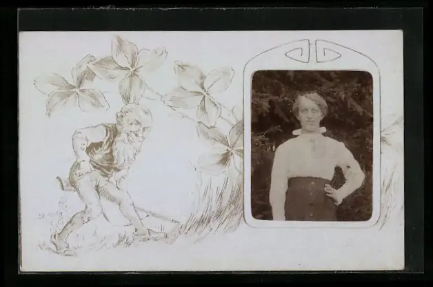 Foto-AK Hübsche Dame in weisser Bluse, Zwerg mit Flinte im Passepartout