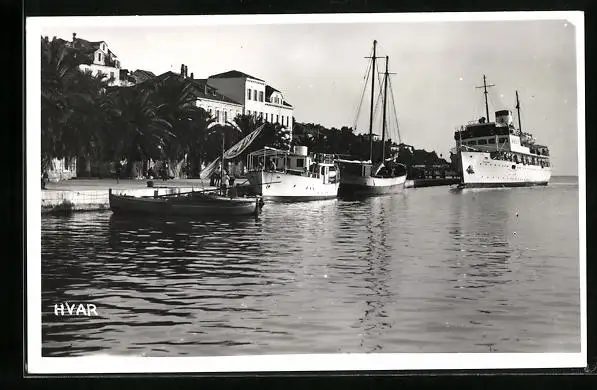Foto-AK Hvar, Uferpartie mit Dampfern