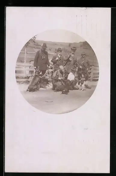 Foto-AK Jäger mit ihren Dackeln und Jagdhunden