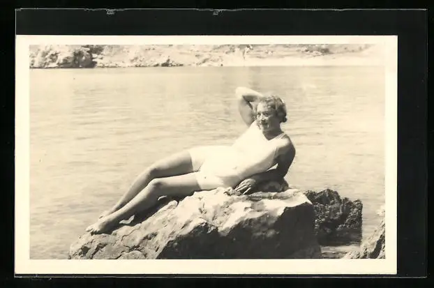 Foto-AK Junge Dame posiert auf Felsen am Strand